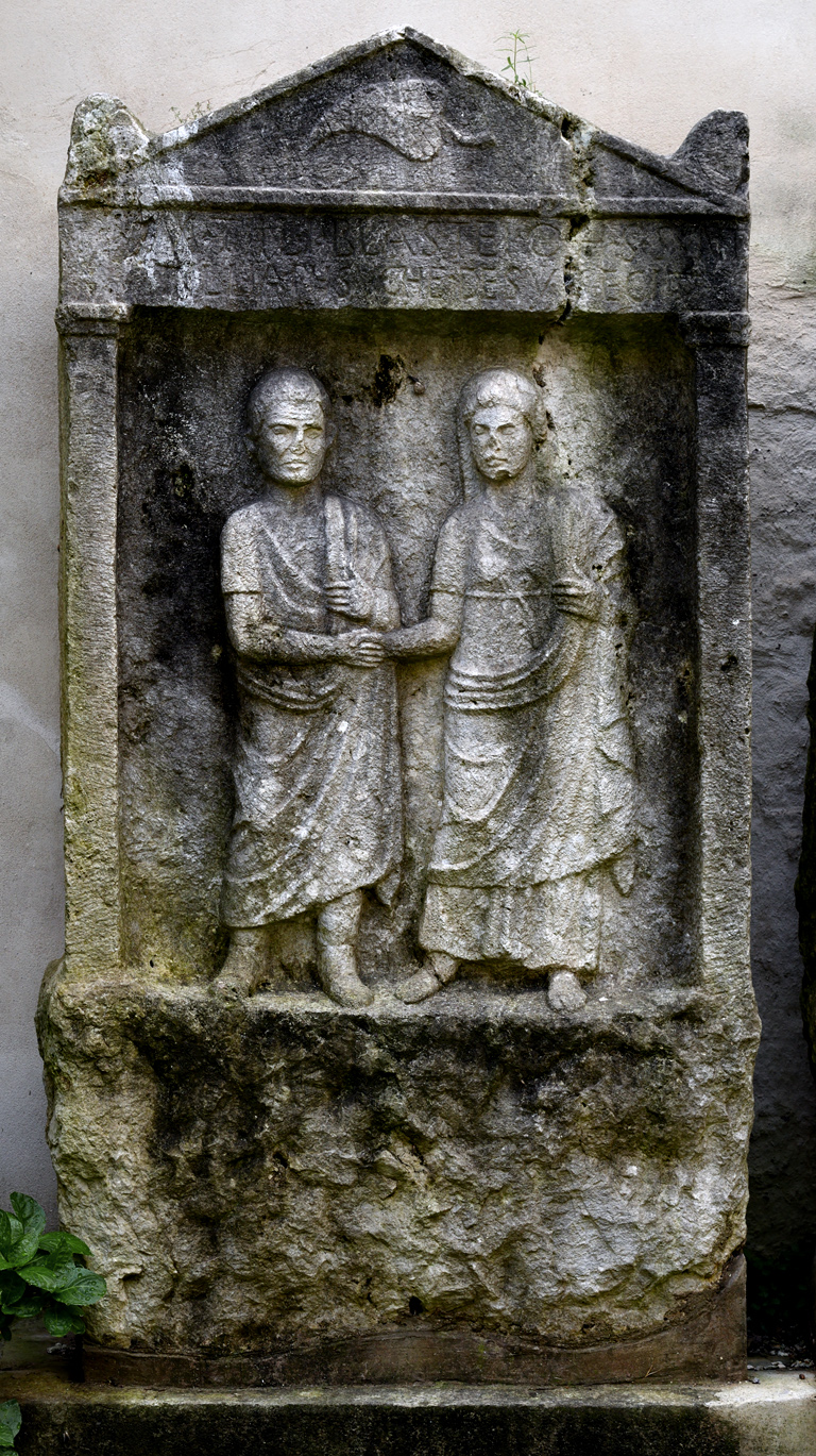 Вертикальная стела в виде эдикулы из известняка, установлена на высоком необработанном постаменте, поверхность которого повреждена. Стела содержит нишу большого размера; фронтон, расколотый вертикальной трещиной, украшен рельефом веера в форме лежащего листа плюща В центральном поле, также рельефно, расположены две хорошо сохранившиеся фигуры. Мужчина в тоге, с туникой; ноги обуты в короткие сапожки. Женщина стоит с покрытой головой (capite velata), причесанной в стиле "Октавия"; они обмениваются рукопожатием (dextrarum iunctio, dexiosis). Оба лица сохранились; лицо женщины более обобщенное, а лицо мужчины явно портретное. Надпись, состоящая из двух строк, расположена на архитраве.