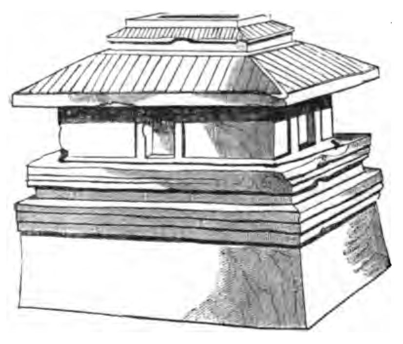 Эту раннюю разновидность дома, использовавшуюся латинским народом, тщательно воспроизводят маленькие погребальные «дома-урны», которые во множестве обнаруживаются на ранних кладбищах центральной Италии и в других местах. Их конструкция несколько сложнее, и крыша, видимо, образована из отдельных ветвей, уложенных так, чтобы образовать выступающие карнизы. Эти любопытные образчики архаической керамики имеют маленькие подвижные двери, запирающиеся на деревянный крючок(2).