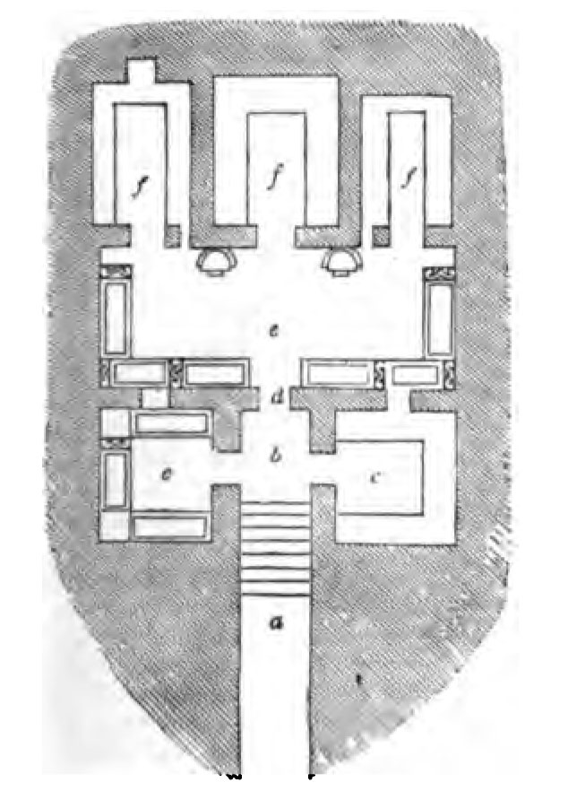 Крышу мужского зала поддерживали четыре промежуточные колонны (κίονες), которые, как и все колонны в Тиринфе, были изготовлены из дерева и стояли на тщательно выровненных каменных блоках. От крыши не сохранилось ничего, кроме обугленных фрагментов и пепла, но о её конструкции можно сделать предположение на основании ранней скальной гробницы во Фригии, обнаруженной профессором Рэмси(3). В ней в скале вырезана копия деревянной крыши: это простая крыша с пологими скатами, которая имеет главную стропильную балку с затяжкой и бабкой. По мнению некоторых комментаторов, эти главные стропила у Гомера называются μεσόδμαι (Hom. Od. XIX.37);1 маленькие стропила или потолочные балки — δοκοί (Od. XXII.176), сам потолок — μέλαθρον (Od. VIII.279), а вся крыша — ὀροφή (Od. XXII.298). Такую же планировку зала с центральным очагом и колоннами, поддерживающими крышу, д-р Шлиман обнаружил в Гиссарлыке, и в обоих случаях имелось также открытое крыльцо с деревянными колоннами.