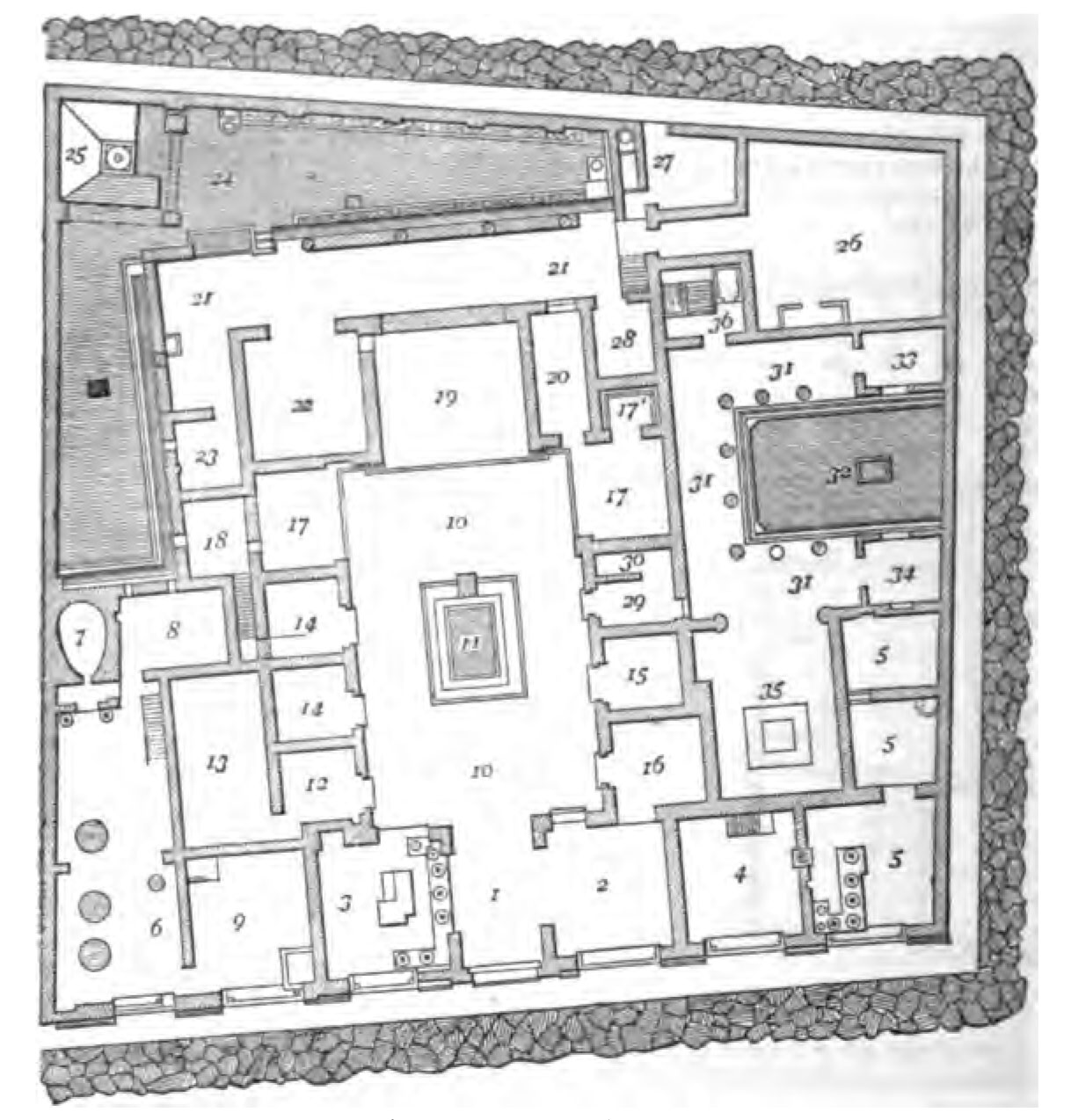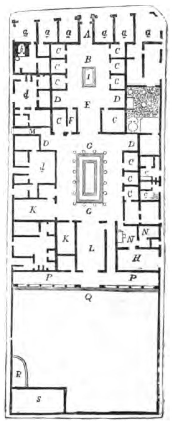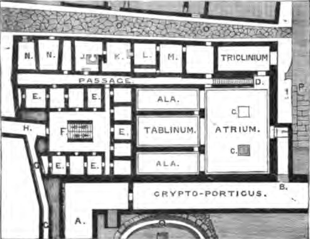A — прихожая (ostium) с напольной мозаикой. B — этрусский атрий. I — имплювий. C — комнаты по обе стороны атрия, с.682 вероятно, для приёма гостей. D — ала. E — таблин, открывающийся в перистиль, так чтобы просматривалась вся длина дома; но поскольку рядом с ним имелся проход (fauces), F, таблин, вероятно, мог закрываться по желанию хозяина. C — комнаты рядом с проходом (fauces) и таблином, назначение которых неясно. G — перистиль. D — ниши в перистиле. C — спальни (cubicula) рядом с перистилем. K — триклиний. L — гостиная (oecus), и рядом с ней коридор из перистиля в сад. M — задняя дверь (posticum ostium) на улицу. N — кухня (culina). H — помещение для слуг с задней дверью на улицу. P — двухэтажный портик, свидетельствующий, что дом имел два этажа. Однако местоположение лестницы неизвестно, хотя считается, что в одном из коридоров, M, сохранились её следы. Q — сад. R — резервуар для наполнения цистерны, S.