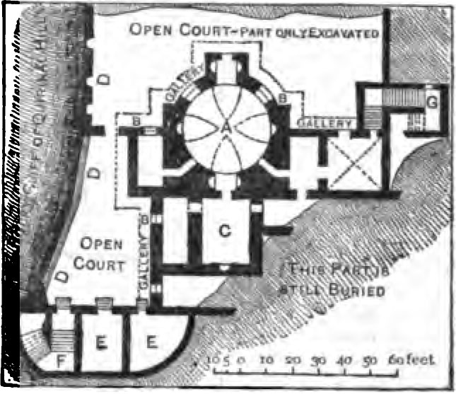 Планировка дворца в Тиринфе. — Глубокая древность этих руин иногда оспаривается, но обнаружение такого же доисторического здания в Микенах положило конец всем сомнениям относительно датировки Тиринфского дворца. В целом свидетельства об общей планировке здания, методах его строительства и стиле его отделки исчерпывающе доказывают, что этот дом принадлежит к далёкому доисторическому периоду греческой архитектуры, который, по всей вероятности, предшествовал вторжению дорийцев на Пелопоннес. Сам этот дом занимает более трети тиринфского акрополя, массивные камни которого изумляли Геродота, Диодора и Павсания и стали ассоциироваться с легендами о Геракле, Персее и загадочных циклопах, которые якобы их построили. На прилагаемой схеме изображён план здания, тщательно спроектированного в соответствии со своими конкретными задачами.