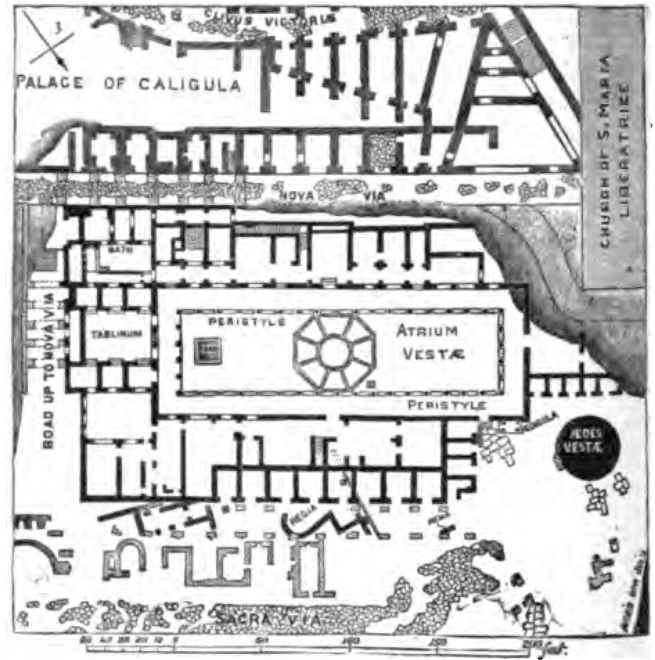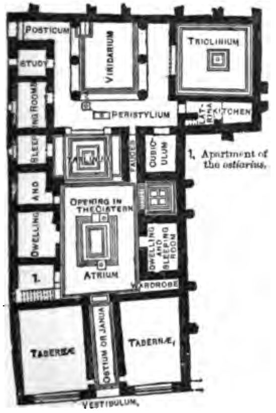 Подобно большинству других домов в Помпеях, он не имел вестибула в том смысле, который мы придаём этому слову (см. выше, с.668 b). Прихожая (ostium) в ширину имеет 1,8 м, а в длину — почти 9 м, что обусловлено наличием лавок по обеим сторонам. На полу возле входной двери имеется мозаика с большой свирепой собакой, а под ней надпись «Берегись собаки» (cave canem). Две большие комнаты по обеим сторонам прихожей, судя по большим проёмам, были лавками; они сообщаются с прихожей и, следовательно, должны были принадлежать хозяину дома. Длина атрия около 8,5 м, а ширина — около 6 м; имплювий находится примерно в центре комнаты, и его пол вымощен белыми тессерами, среди которых изредка встречаются чёрные. В левом углу атрия находится маленькая комната (на плане отмечена 1) — возможно, каморка (cella) привратника (ostiarius) с лестницей, ведущей в верхние комнаты. С каждой стороны атрия расположены комнаты для семейного использования или приёма гостей, которые вправе были рассчитывать на гостеприимство. Если в доме не было комнат, специально предназначенных для приёма гостей (hospitium), их, видимо, размещали в соседних с атрием комнатах. [HOSPITIUM] В дальнем конце атрия находится таблин с боковым проходом (fauces), ведущим в перистиль с дорийскими колоннами и садом (viridarium). Большая комната справа от перистиля — триклиний, рядом с ней — кухня с уборной (latrina).