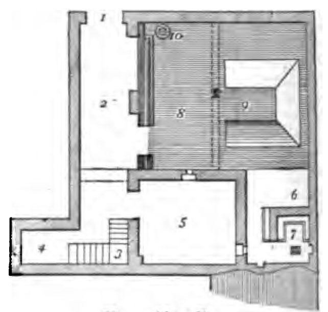 Исследования последних лет показали, что греки повсеместно использовали кирпичи из необожжённой глины вплоть до довольно позднего времени. Этот тезис хорошо доказал д-р Дорпфельд(7), продемонстрировавший, что даже значимые строения, такие как храм Геры в Олимпии и стены вокруг Афин, разрушенные Суллой, были сооружены главным образом из высушенного на солнце кирпича. Эти же непрочные материалы обычно использовались и при строительстве частных греческих домов, и именно поэтому сохранилось так мало примеров эллинской архитектуры жилища. Обожжённые кирпичи впервые стали использовать римляне(8). До недавнего времени было известно очень мало руин греческих домов. В издании «Ionian Antiquities» упоминается греческий дом на Делосе, план первого этажа которого приводят Гуль и Конер(9). Однако в ходе раскопок, которые Ф. Петри и Э. Гарднер провели в 1884—