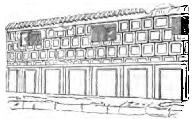 5. Окна. В римских домах было мало окон (fenestrae). Атрий и перистиль, как мы видели, освещались сверху, а в выходившие в них меньшие комнаты свет, как правило, поступал из них же, а не из окон на улицу. Видимо, только комнаты на верхних этажах (cenacula) обычно освещались через окна и выходили не только во внутренние дворы, но и на улицу. Поэтому они часто упоминаются античными авторами (Liv. I. 41; XXIV. 21; Hor. Carm. I. 25; Prop. IV. (V.) 7. 16; Juv. III. 270; Mart. I. 86; XI. 19; Plin. NH. XIX. 59). В Помпеях помещения первого этажа тоже обычно освещались через внутренние дворы, так что внизу было мало окон, открывавшихся на улицу. Исключением является дом Трагического поэта, имеющий шесть окон на первом этаже. Но даже в этом случае окна расположены не над землёй, как в современном доме, а на высоте 2 м над тротуаром, который на 40 см приподнят над серединой улицы. Окна невелики — размером едва ли 90 на 60 см, а сбоку имеется деревянная рама, в которой окно или ставень можно было перемещать назад и вперёд. Нижнюю часть стены занимает ряд красных панелей высотой 1,4 м. На приведённой гравюре изображён вид с улицы на часть стены с оконными проёмами наверху. Плитка на стене современная и помещена туда только для защиты от непогоды.