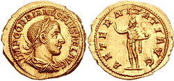 Аурей, золото Монетный двор: Рим, дата чеканки: 240—241 гг. вес: 5.02 г; диаметр: 20.08 мм;