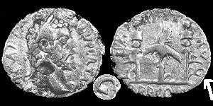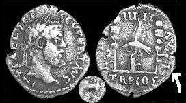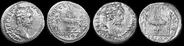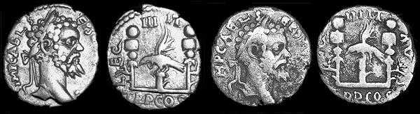 Монета справа очень загадочна. Стиль, в котором она выполнена, и, в частности, орел, не встречается больше нигде. Лицевая сторона монеты уникальна. Надпись на ней имеет нестандартную аббревиатуру SEPTIM имени императора.