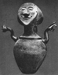 Проблема происхождения скульптурного портрета Этрурии тесно связана с религиозными воззрениями древних этрусков. Религия этого загадочного народа древней Италии, как и его происхождение, история и культура в целом, известна еще недостаточно. О том, что в религии этрусков культ мертвых играл чрезвычайно большую роль, свидетельствуют роскошные гробницы, снабженные богатыми погребальными дарами. Важное место в культе мертвых, несомненно, занимала идея [с.11] сохранения внешнего облика умершего, может быть, как залога его потустороннего бессмертия (по аналогии с религией Древнего Египта). У этрусков уже в раннее время вместилище праха умершего — урна, хранившая пепел сожженного тела, снабжалась изображением человеческого лица. Много подобных урн найдено на некрополе одного из крупных центров Этрурии — Кьюзи. Древнейшие урны из Кьюзи имеют форму сосуда, закрытого круглой крышкой. Они изготовлялись из бронзы и глины. Уже в VIII—VII веках до н.э. крышки украшались масками, схематично и примитивно передающими человеческое лицо. Незначительное число таких бронзовых масок сохранилось до наших дней — примером их служит маска из Кьюзи первой половины VII века до н.э.