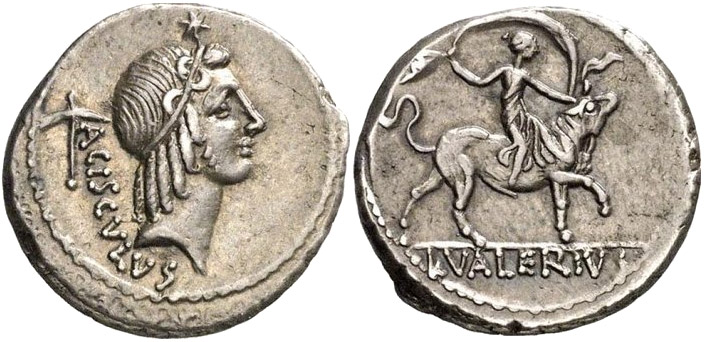 Отметим, однако, что изображение реверса не полностью соответствует старинной легенде. В мифе про Валерию Луперку говорится о телке, тогда как монеты показывают женщину, едущую на быке. Как кажется, римские мастера монетного двора, не знакомые с фалерийскими мифами, реализовали замысел монетария в традиционной манере. Валерия Луперка на телке превратилась под их резцами в Европу, похищаемую Зевсом-Юпитером. Однако, между денариями Валерия Ацискула и отчеканенными на 35 лет ранее денариями Л. Волумния Страбона, действительно изображающими миф о похищении Европы, есть большие отличия. Изображение реверса — девушка на быке — сопровождается символом Зевса-Юпитера, молнией, а сам верховный бог помещен на аверсе. Кроме того, бык с денариев Волумния бешено мчится влево, а левая сторона традиционно ассоциировалась у людей античности с западом. Напомним, что Европа была похищена в Финикии и доставлена в Грецию, то есть ее путь проходил в западном направлении.
