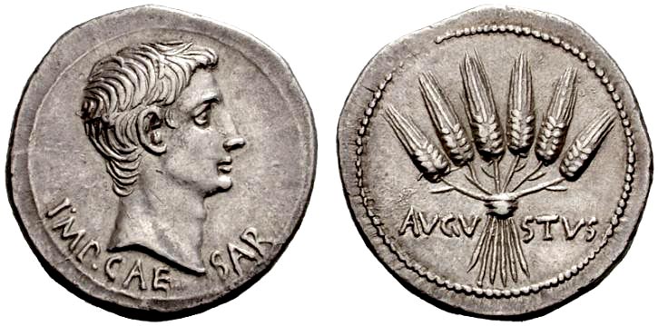 В монетной чеканке прибытие Августа на Восток связано с возобновлением чеканки традиционной для Малой Азии монеты — кистофоров. Данный экземпляр был отчеканен в Эфесе в честь прибытия императора. Изображение колосьев на реверсе символизировало изобилие, которое должно было последовать за этим событием…